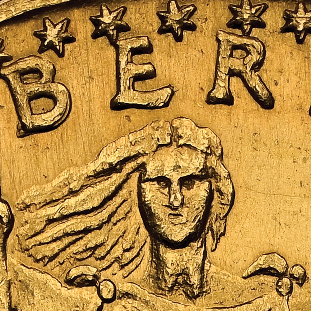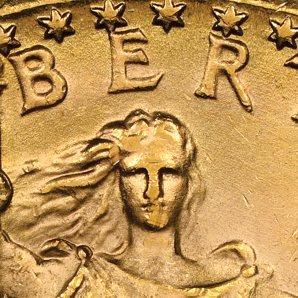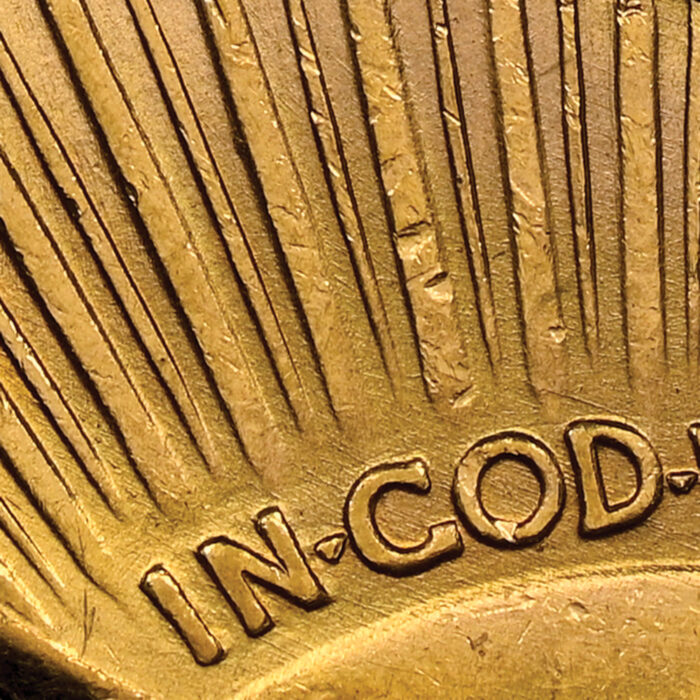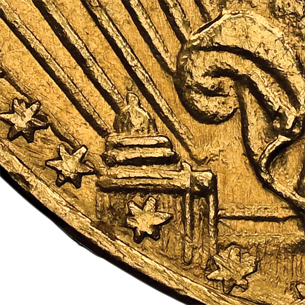 The counterfeit lacks the natural smooth luster that would be expected on a genuine coin. Its roughness stands out in several areas, including the pimpling on the sun on the reverse. The rays are also too sharp; note how they gently fade on a genuine example. While a fake double eagle has no numismatic value, it is worth checking to see whether it is struck in the expected 90-percent gold. Unfortunately for this coin’s owner, it is brass.