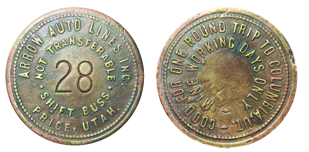 The company issued tokens that are quite a bit different than most transportation tokens because, as its inscription indicates, the firm used them strictly to transport workers to the mine. Struck in brass, the 34mm token’s obverse inscription reads ARROW AUTO LINES INC./NOT TRANSFERABLE/SHIFT BUSS/PRICE, UTAH, and a large incuse number appears in the center. On the reverse, GOOD FOR ONE ROUND TRIP TO COLUMBIA, UT. is around the rim, with MINE WORKING DAYS ONLY below.