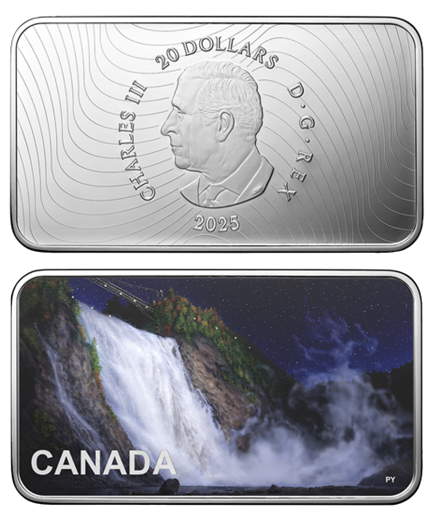 Unlike previous releases in the collection, the Lady in White specimen presents its ghost story in a horizontal orientation on a rectangular coin, depicting the cascading Montmorency Falls and a suspension bridge beneath a night sky. When viewed with a black-light flashlight (included with purchase), the Lady in White appears in the mist to the right of the falls, and the lights on the suspension bridge glow. The $20 silver coin is available for CAD$154.95 on the Royal Canadian Mint’s website.