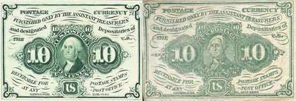 Above is a pair of 1st issue 10-cent postage currency notes; one is real and the other is a counterfeit. The portrait is most telling. On the genuine note, it closely resembles George Washington. The president’s image is cartoonish on the fake. His coat and shirt are crude, his hair looks like a wig, and his eyes and nose are poorly executed. The rest of the counterfeit note also lacks the precise printing we find on a genuine example.