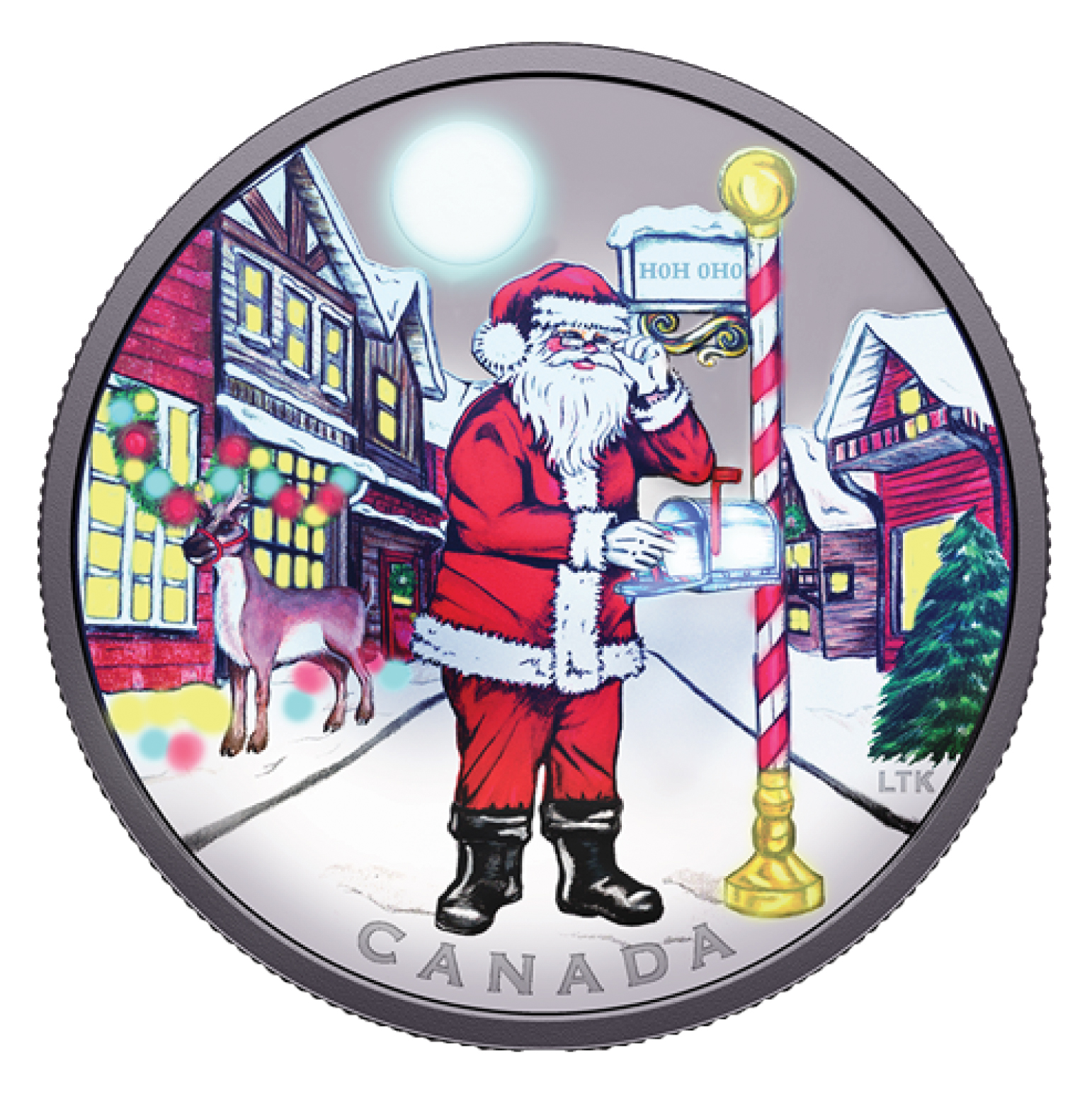 The Royal Canadian Mint is preparing to welcome Santa Claus this year with a festive coin. Lisa Thomson-Khan designed the colorful reverse, which depicts Santa’s home and workshop at the North Pole. In the center, Santa adjusts his glasses while checking his mailbox for the latest letters from children around the world. The sign on the candy cane mailbox pole reads H0H 0H0, the official Canadian postal code for the North Pole. In the background, one of Santa’s reindeer stands outside a decorated building, illuminated by the light of a full moon. The legend CANADA appears underneath the design. When viewed under a black light (included with purchase), the holiday decor, moon, mailbox, and top and base of the pole all glow in the dark. The obverse features Steven Rosati’s effigy of King Charles II.