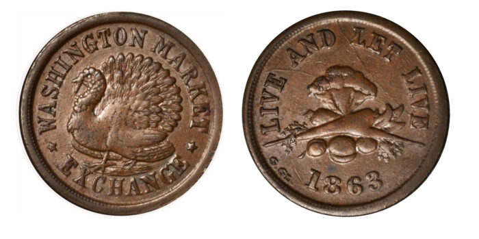 This 1863 storecard advertising the Washington Market Exchange features a turkey on the obverse. (Photos: Stacks’ Bowers Galleries)
