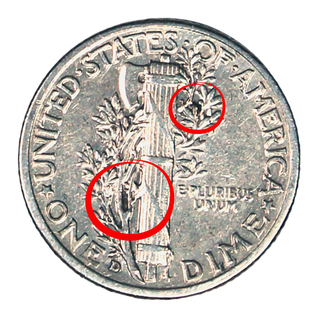 This 1943-D dime has been dipped. Note the residual grime trapped in recessed areas missed by the dipping.  (Photo: Kevin Wang)