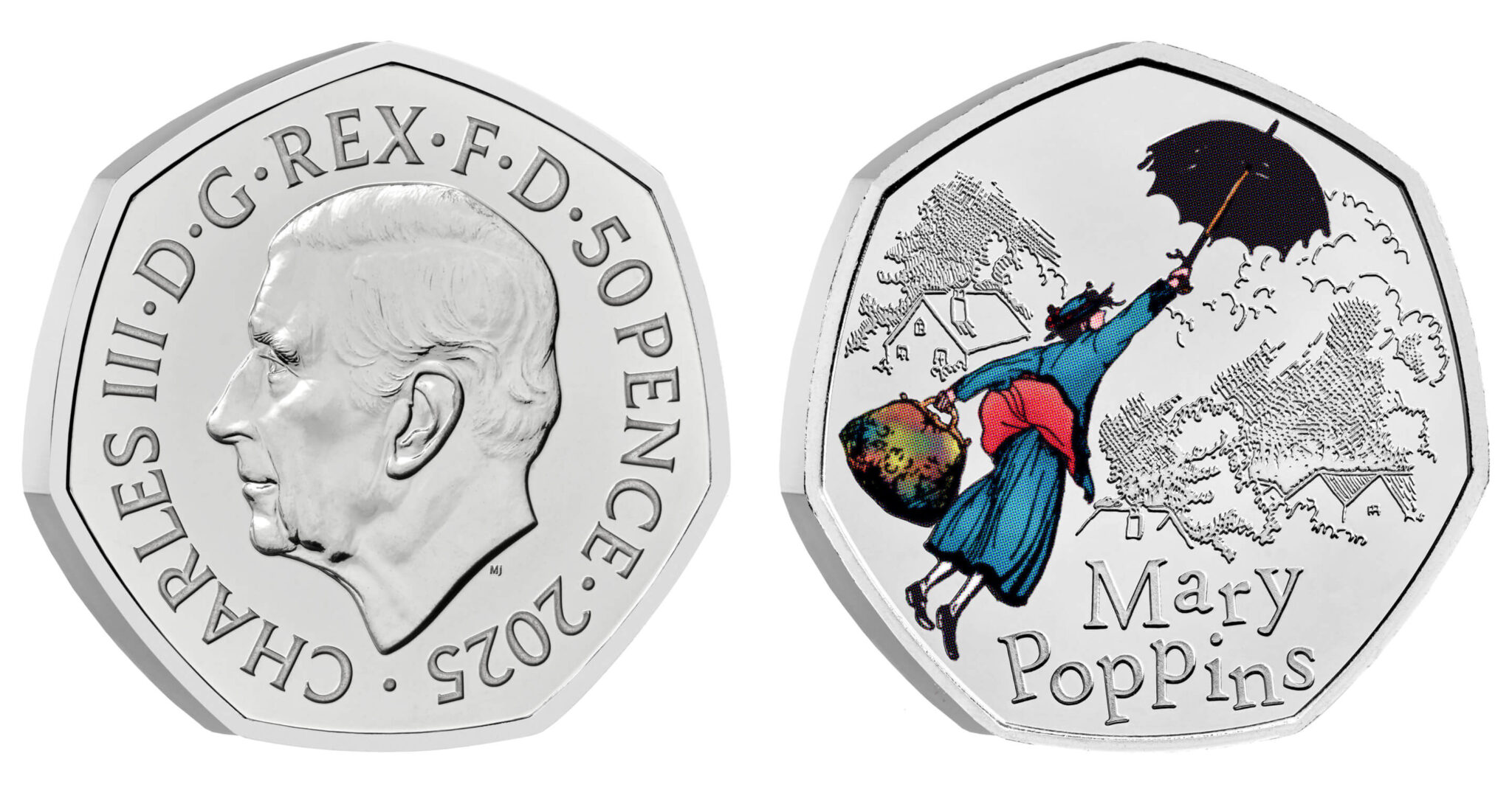 To celebrate author P.L. Travers’s beloved character Mary Poppins, the Royal Mint has released a set of commemorative coins depicting the fantastical nanny. The reverse of the 50 pence is based on Mary Shepherd’s original illustration from the classic Mary Poppins books. In the design, Mary Poppins flies over a neighborhood with her umbrella while holding her magic carpet bag. Her name appears below the scene. The commemoratives mark the first time Mary Poppins has appeared on a UK 50-pence coin and are available in brilliant-uncirculated, brilliant-uncirculated color, silver proof color, and gold versions.