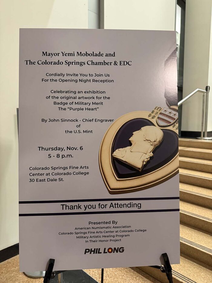 The Colorado Springs Fine Arts Center at Colorado College recently hosted an opening night reception for the Purple Heart Exhibition. The event highlighted the original artwork for the Purple Heart Badge of Military Merit, designed by John Sinnock, former Chief Engraver of the U.S. Mint. Presented in partnership with the City of Colorado Springs and the Edward C. Rochette Money Museum, the exhibition featured four special displays: Military Medals, The Purple Heart Original Drawings, George Washington’s Life Mask, and highlights from the Baker-Manley Washingtonia Collection.