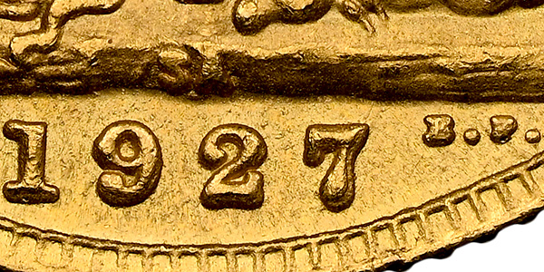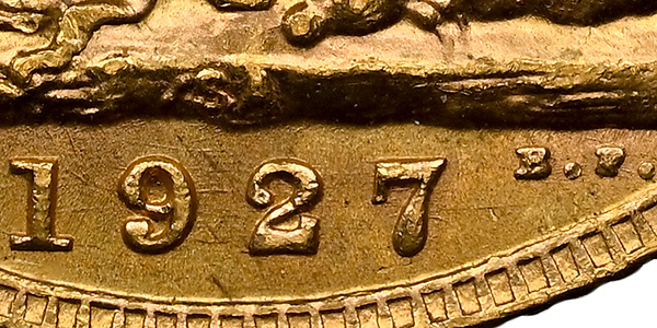 Instantly noticeable is a large gouge running across the back of King George V’s head and emerging into the field to the right. This could be an attempt to determine whether the coin was actually struck in gold or was instead plated. While the coin is in fact made of gold, that does not mean it is an authentic example.