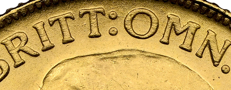 A closer examination of the date and the designer’s initials (B.P. for Benedetto Pistrucci) next to it show that they are too bulbous, which is easy to see when compared to a genuine example. The top of the obverse also has some prominent toolmarks, which is unexpected with a genuine example.