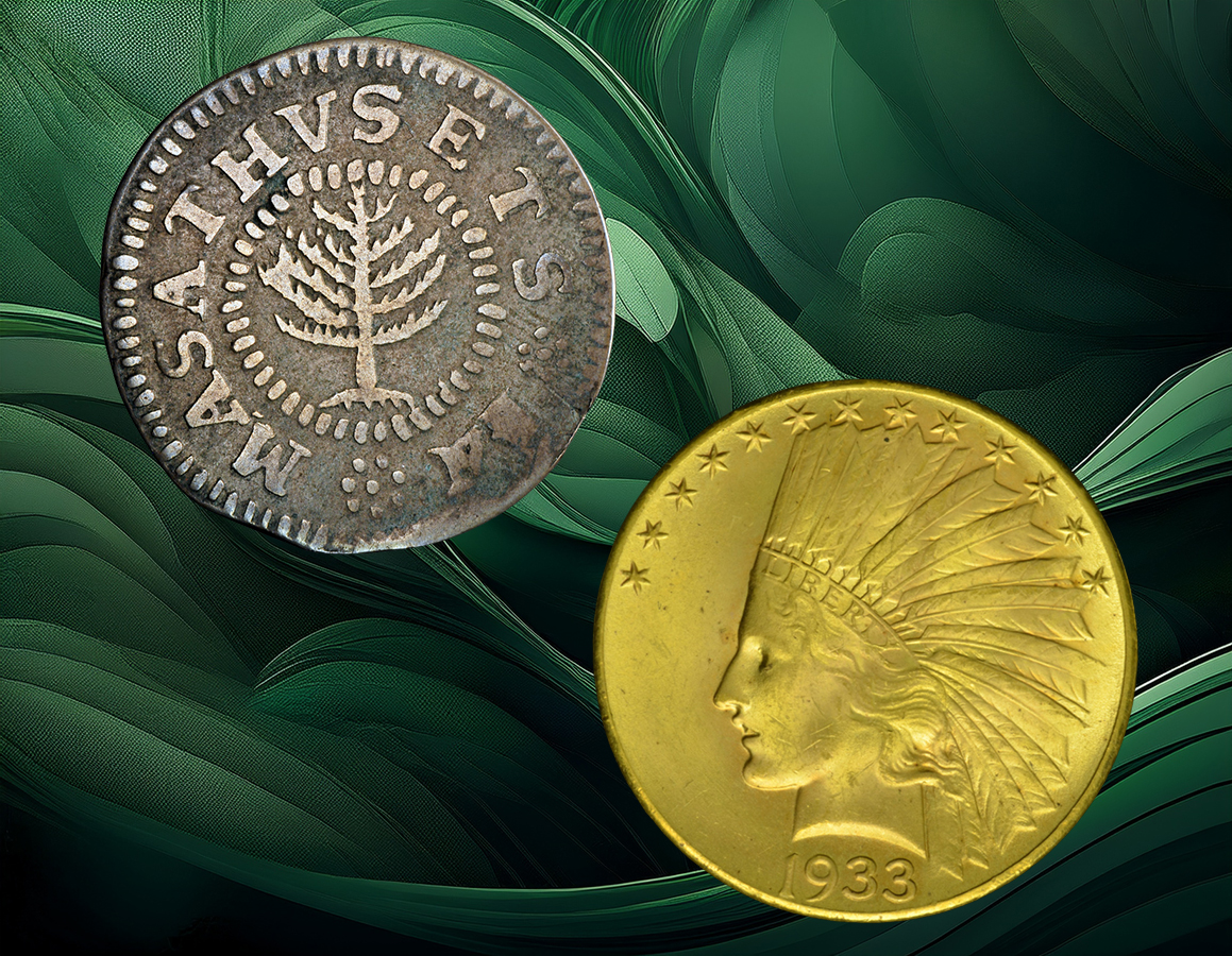 The Americana exhibit features rarities like the 1652 Pine Tree shilling and the 1933 Indian Head eagle (gold $10). (Photos: ANA Archives)