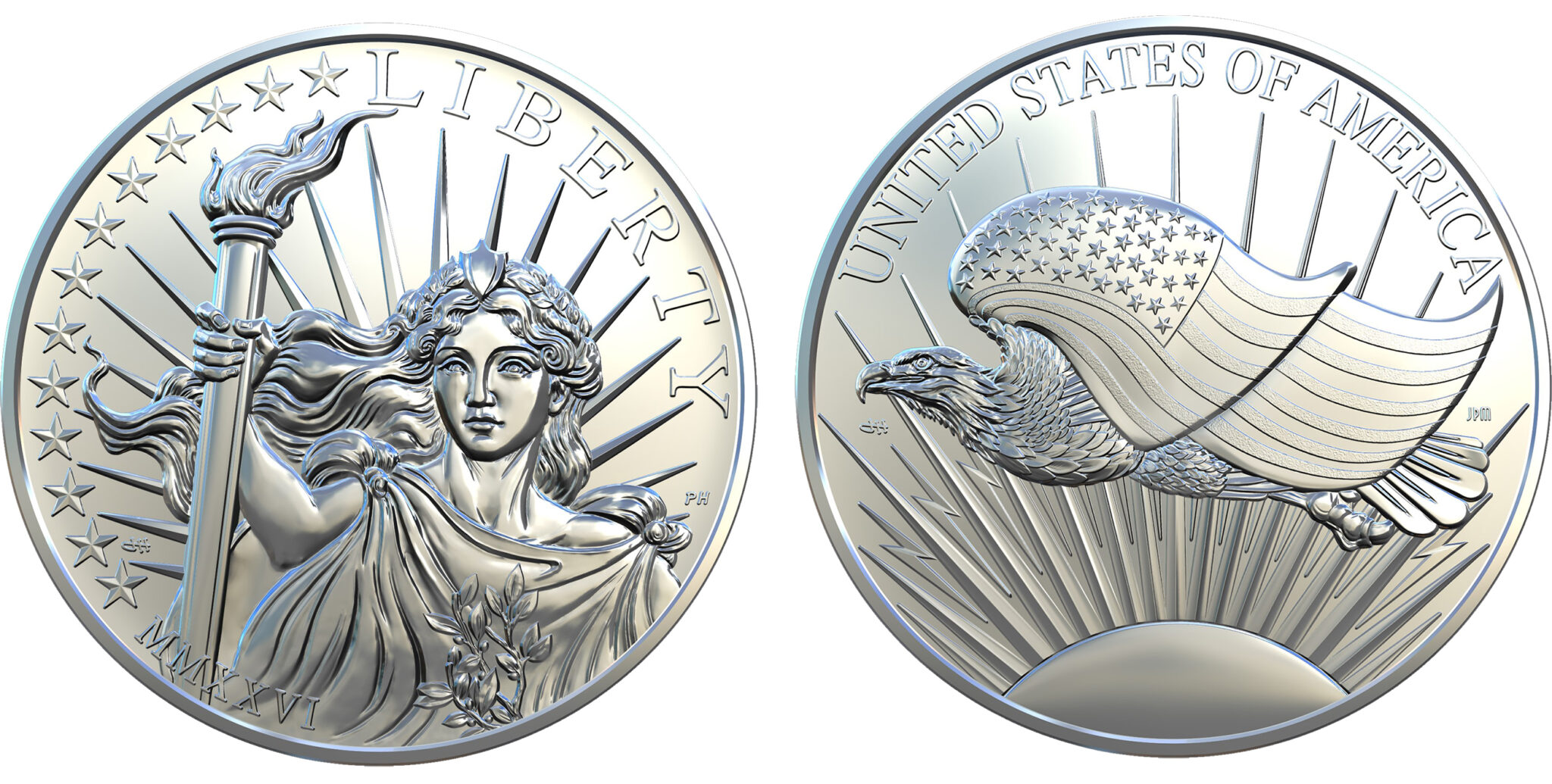 The companion silver medal reimagines the historic coin with a close-up of Lady Liberty and 13 stars to represent the original colonies, while the reverse depicts the eagle’s wings as an American flag. To purchase, visit the U.S. Mint’s website.