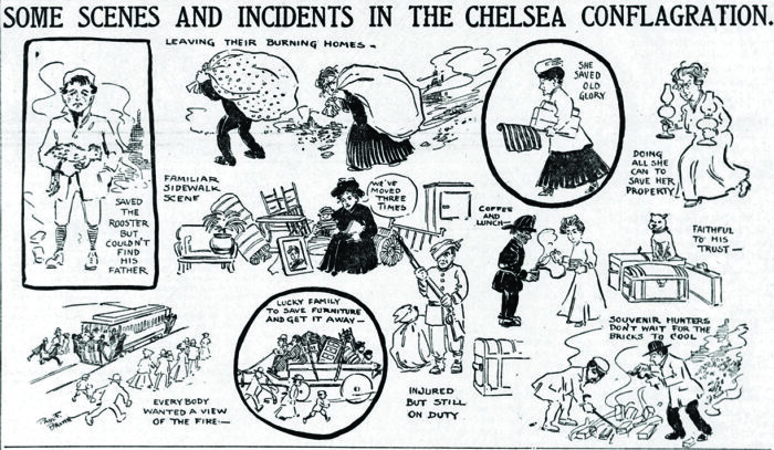 The front page headlines in the April 13, 1908, issue of the The Boston Globe newspaper told the story of the disaster succinctly: “1000 BUILDINGS BURNED, DAMAGE $12,000,000.” Beneath that, smaller headlines read, “CHELSEA FIRE COSTS THREE LIVES, HUNDREDS INJURED…350 ACRES FLAME-SWEPT—10,000 HOMELESS.” To put that loss in perspective, consider the fact that $12 million back then is equivalent to more than $400 million today.