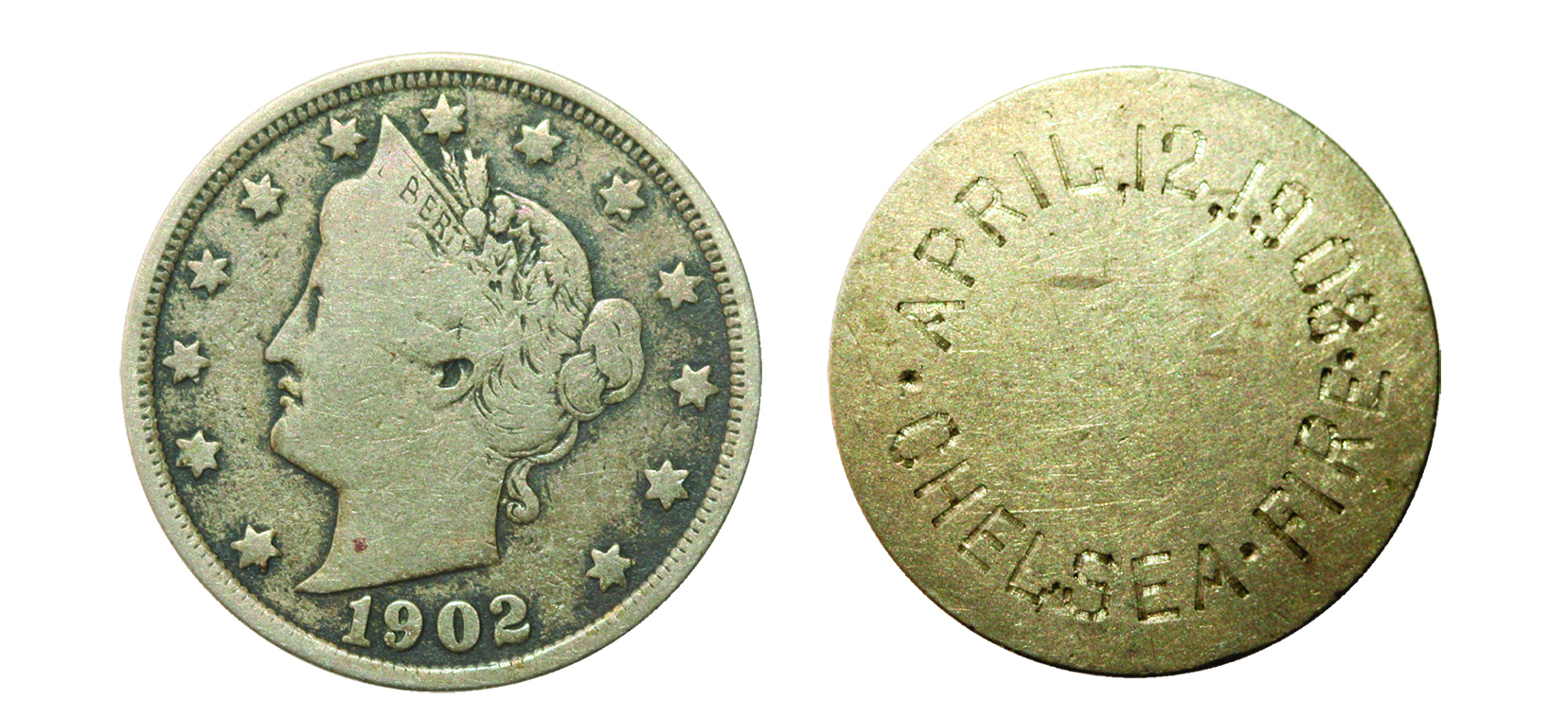 The 1902 nickel bearing the name and date of the Chelsea Fire was likely engraved by a local artisan.