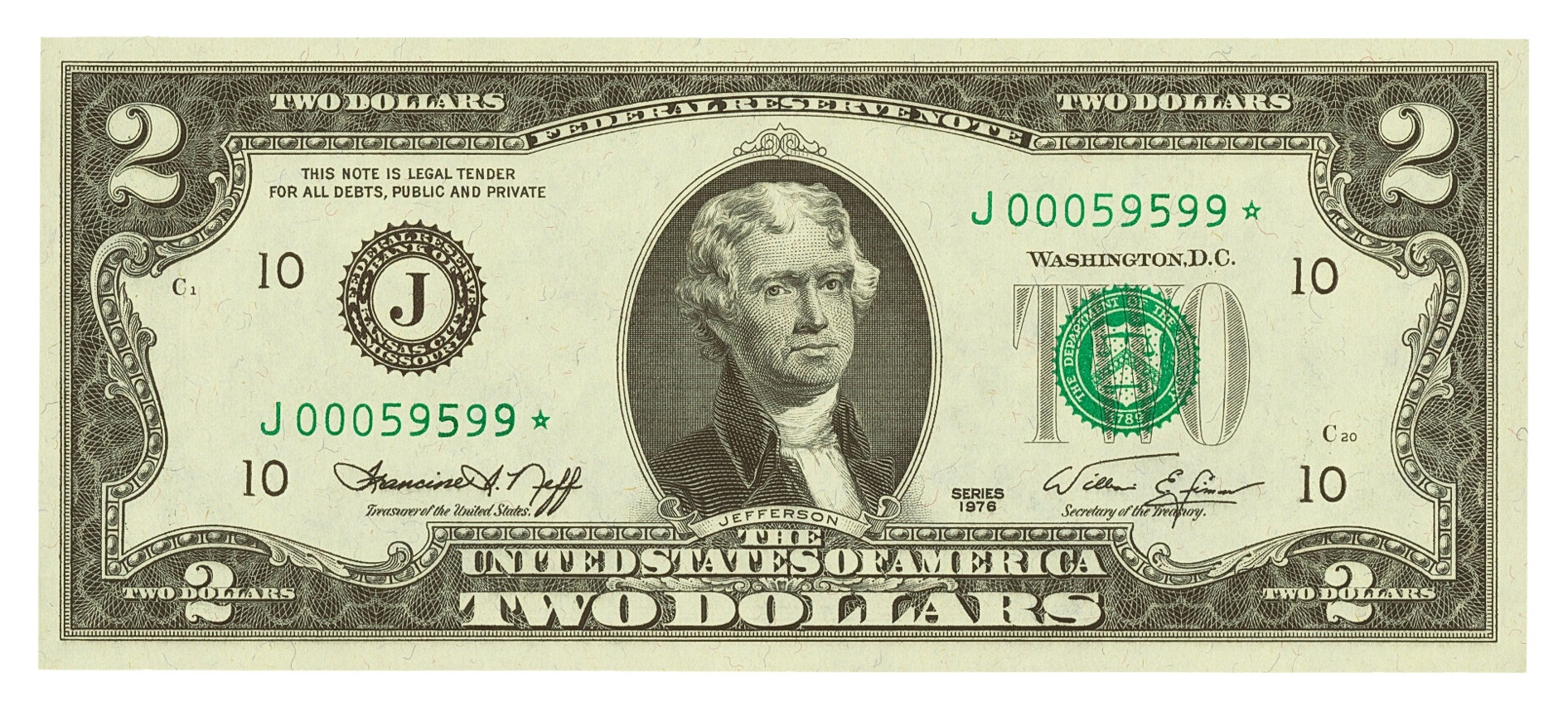 From 1966 to 1976, the bill wasn’t printed because no one was using it. However, in 1976, to celebrate America’s 200th birthday, the U.S. Mint and the Bureau of Engraving and Printing produced some special coins and bank notes. One of these issues was a $2 bill. After a decade-long break in printing, it was revised with a final design change. In an effort to save money printing $1s, the government tried to convince people to use $2s instead. Unfortunately, people falsely believed that they would be worth a lot in the future and kept them, causing the government’s plan to fail. That is why the 1976 $2 is very common today. The design was quite popular though and is still printed.